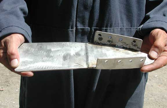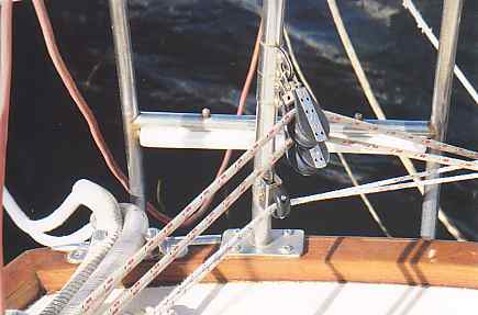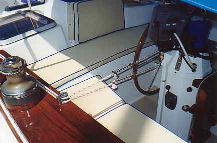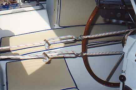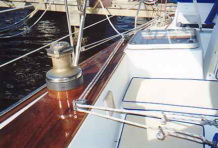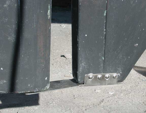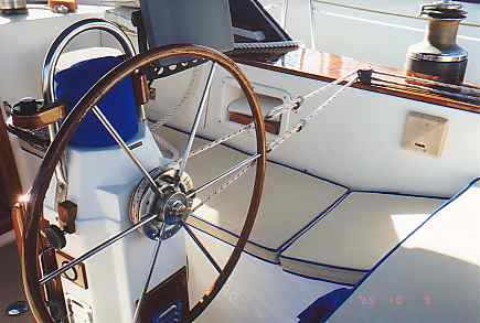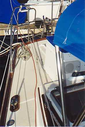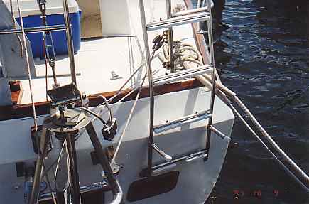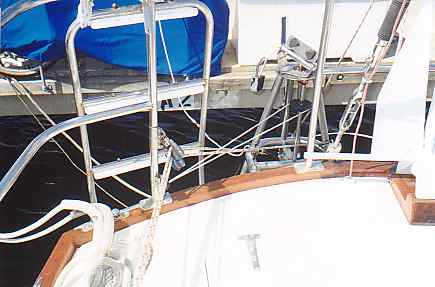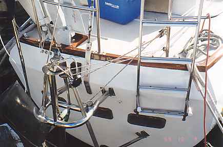 In this section, we include information and pictures some of the project ideas and improvements from other CSY owners. We have a separate section for the improvements we have made on our own boat. Many of them were driven by our plan to sail SIESTA from San Francisco to the Florida Keys, through the Panama Canal. Below is a picture of HEART OF OAK's beautiful and functional swim platform, which includes steps down to the water that neatly tuck out of the way. The platform can be folded way against the transom by removing the stainless steel brackets and the ladder to the deck. Below, Craig Owings showed us his neatly mounted flat panel display which can rotate every-which-way, but can also disappear behind an attractive teak cabinet made by Sarah Owings, a very talented wood-worker. Fouling Preventer Plate, from S/V Jolly Mon, Antigua 44 (hull identical to CSY 44) This modification was installed on Jolly Mon by the time George and Helen Smith purchased the boat. According to George, the plate is attached to the skeg by three screws, and is not attached but overlaps the bottom of the rudder, to prevent lines from fouling between the rudder and the skeg. We implemented the same concept on SIESTA, while in San Carlos, in the Sea of Cortez, Mexico (see pictures below): Fouling Preventer Cable Assembly, from S/V MemoriRose, CSY 44 Pilothouse Description by Ron Sheridan, owner of Memorirose: "Above are three photos of the Propeller Guard cable system showing the Keel end, Skeg end and Entire cable. The Forward End: Two 1 1/2"x3/8" SS straps bent slightly for alignment after the keel to accept turnbuckle (with ALL SS parts, no brass). Several bolts were run thru keel to create sandwich. After end is drilled to accept a bolt for connection to the turnbuckle. Straightforward construction (simple/cheap) at local machine shop. Skeg End: slightly more involved, but with a tape measure and a stool to sit on, the concept evolves as again straightforward. The idea was to create a Horizontal attachment point for the Aft end of the Cable coming from the Aft lower end of the Keel. The plate/attachment point was also to extend back under the Rudder to protect that area from catching an anchor line or fish/crab trap. This plate has to be mounted to the skeg somehow and I chose to attach it to the aft end of the skeg by having it welded at a 90 degree angle to the horizontal surface and reinforced with two uprights. This attachment could have been bored through the sides of the skeg near the bottom with some kind of strap extending around the backside of the lower skeg for the support. Anything that works is OK. The ideas is just to firmly attach a cable (I used 1/4" SS 1x19, 316 grade rigging wire with a STAYLOC fitting on the aft end and a turnbuckle on the front end. I also protected the cable somewhat by covering it with flexible gray PVC. the cover for the turnbuckle was made of various plumbing components of PVS, found at the local Home Dopot outlet with the idea of covering the turnbuckle with a housing that was able to be painted with anti -fouling paint and unscrewable /separable at its thickest point for disassembly or adjustment.)"Installation of Wind Vane on Antigua 44 JOLLY MON by George Smith: