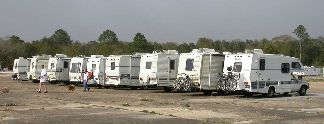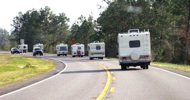 After spending the first evening at the exclusive Blue Angel Campground, a near-by fire required that we all abandon the camp. The locals arranged for all of us to spend the night at a Pensacola Hich-School parking lot. Being adaptable and able to roll away, ready to move the party to a new site, we did not loose much time or momentum, as we regrouped and resumed the culinary and socializing activities for that afternoon and evening. The first photo below shows some of the rigs in caravan headed for the high-school.