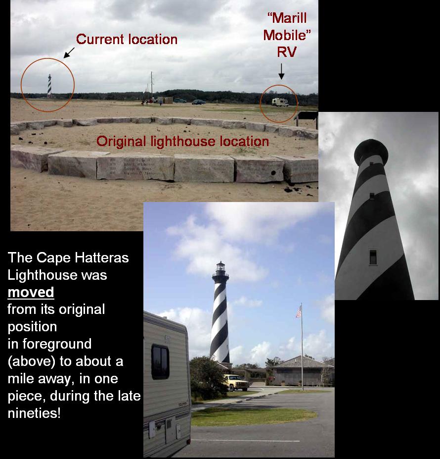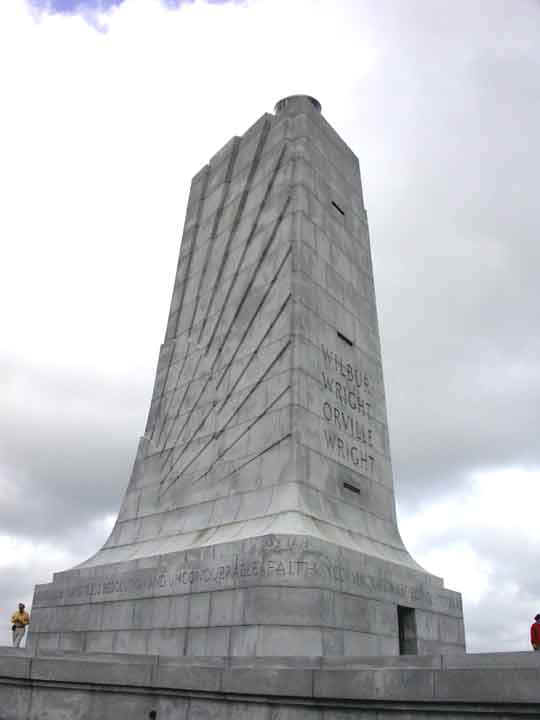 Kitty Hawk: There is a beautiful monument to the Wright Brothers on the hill where they did a lot of glider experimentation prior to their motored flights, down at ground level. In addition to a small museum and modest wooden buildings simulating what was their workshop during their experimentation, there area markers showing how long each flight traveled. The fourth flight was by far the farthest on that memorable day.