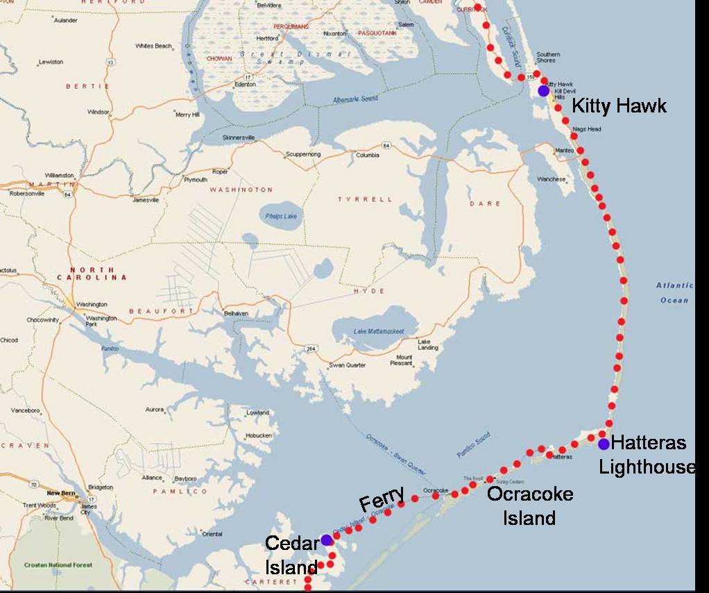 We visited Kitty Hawk, where the Wright brothers started aviation history. Then we toured the famous Hatteras Lighthouse, close to where many ships were lost. From there we took a short ferry to Ocracoke Island, and then a 2 and a half hour ferry from there to Cedar Island, on the mainland of North Carolina.